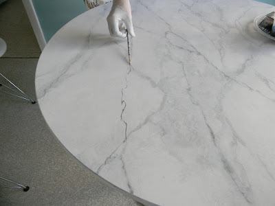 Now to get down to business. We will be "fauxing" Carerra marble on an IKEA Docksta table to make it look more like a marble top Saarinen table. I have been marbleizing my Formica counters all week and thought the Docksta would be a good size for a quick project.